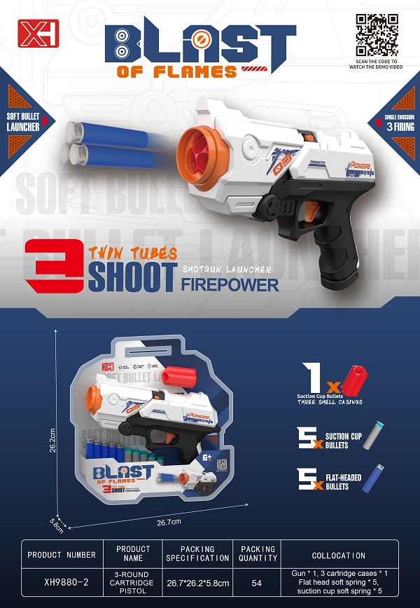 3发弹壳散弹手枪,后拉上膛,轻松快捷,炫酷玩法,配置:三孔弹壳*1,平头旋风软弹*5,吸盘软弹*5,快来扣动扳机体验3发齐射的散弹快感